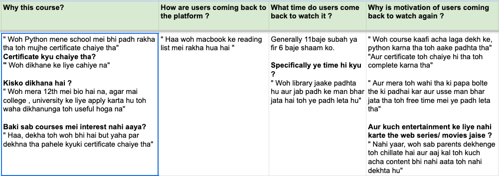 Spoke to users who had engaged till the end of the course and try to understand everything about them: why they came to the course, why did they start watching and what hooked them till the end?