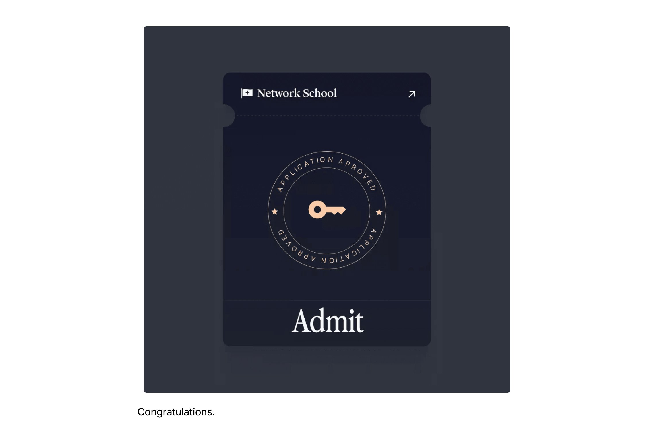 Almost everyone with a normal X or LinkedIn profile and a good reason for wanting to come gets in. Just apply at the NS website and wait for a confirmation email. Which looks something like: